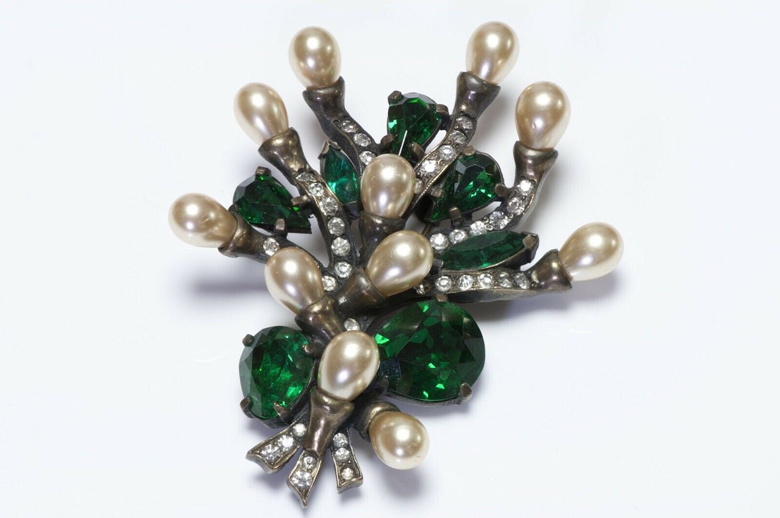 EISENBERG Original 1940’s Green Crystal Pearl Flower Brooch