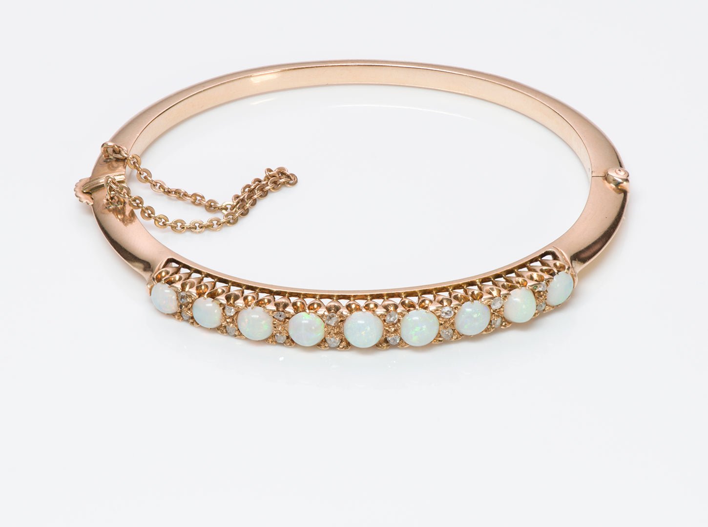 A refined antique 14K yellow gold bangle bracelet set with luminous opals and sparkling diamonds, radiating elegance and sophistication. The graceful curve and delicate gemstone arrangement capture the romantic spirit of a bygone era.
