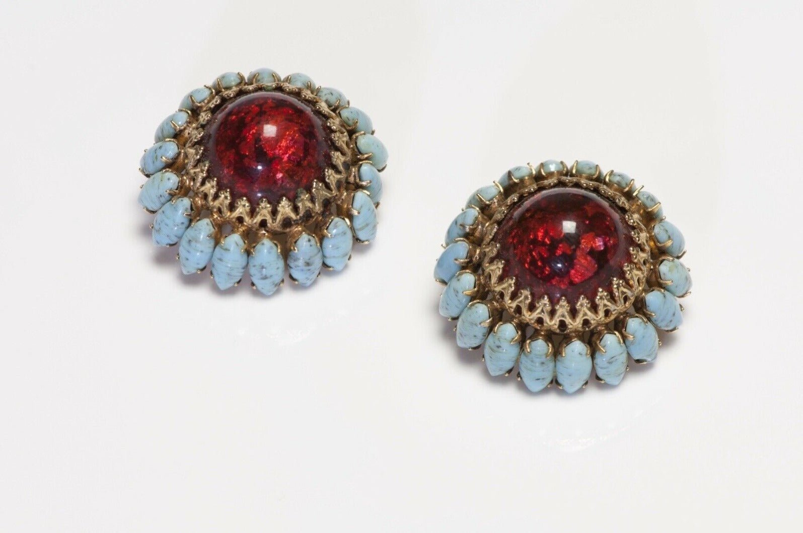 Schreiner NY 1950’s Red Cabochon Glass Blue Crystal Flower Earrings