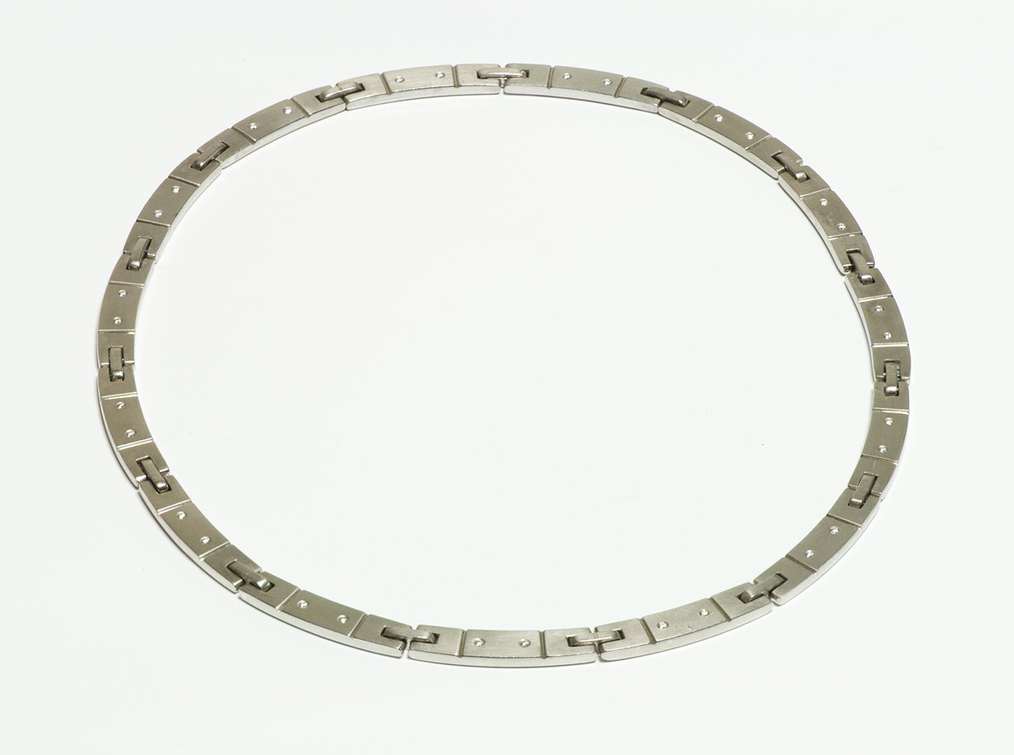 An exceptional and rare design from the Tiffany & Co. Streamerica Collection, this striking collar necklace is crafted in solid 18K white gold and accented with brilliant-cut diamonds. Inspired by the sleek lines and industrial motifs of the Streamline Moderne era, Streamerica was one of Tiffany’s boldest design directions—making pieces from this collection highly collectible today.